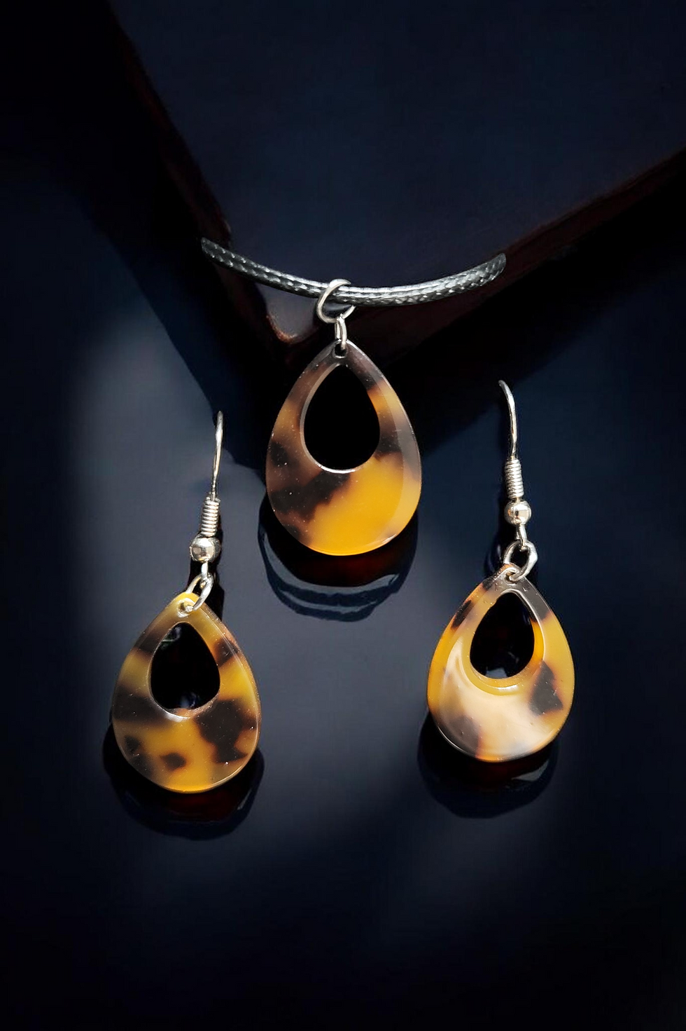 Parure bijoux écaille marron et doré – Collier et boucles d’oreilles goutte