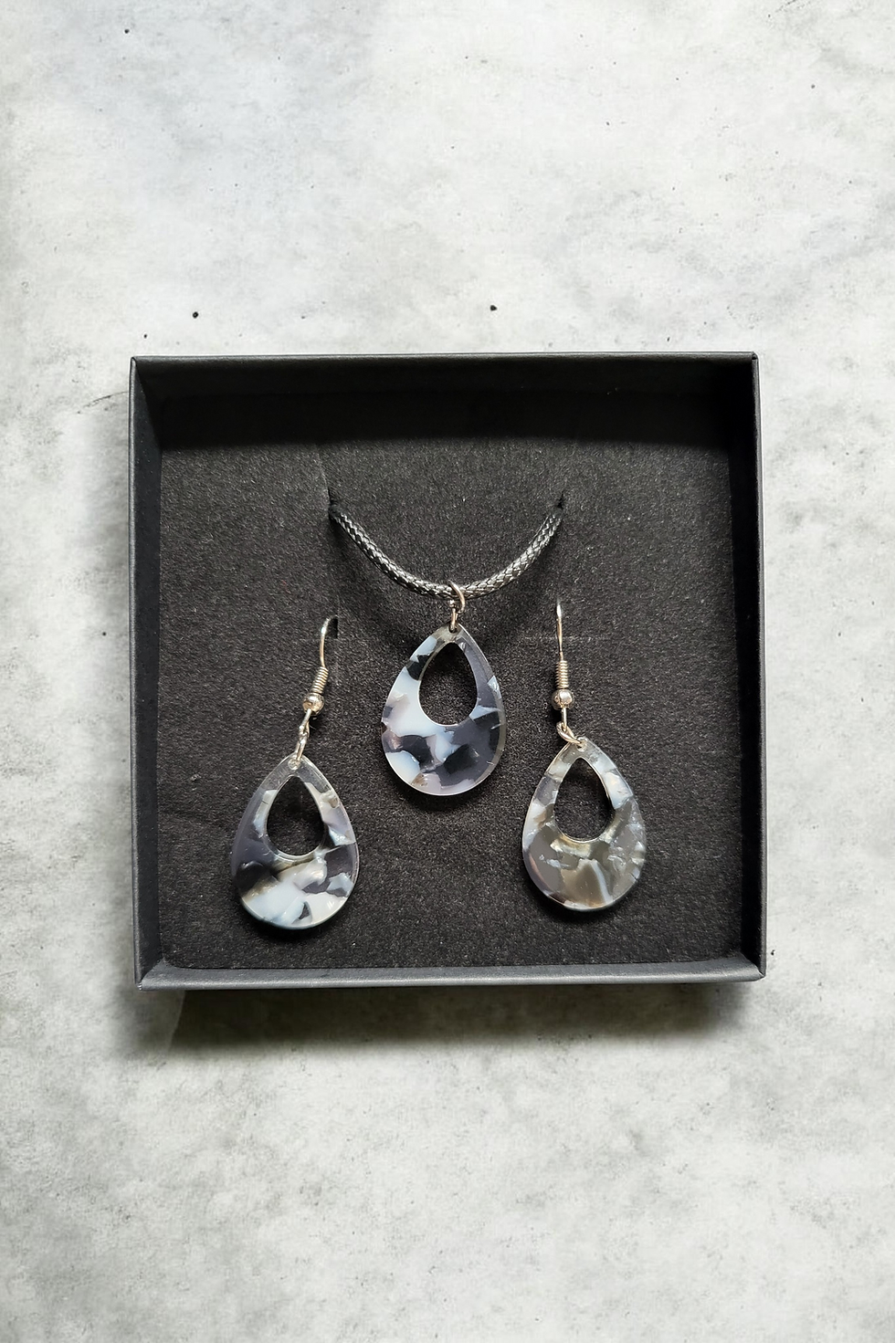 Parure bijoux noir et gris marbré – Collier et boucles d’oreilles goutte